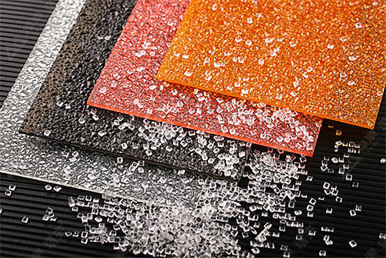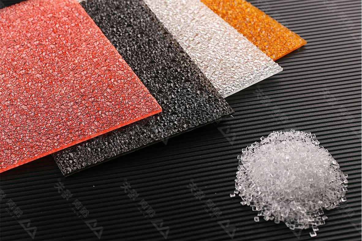 PC颗粒板是表面布满类似钻石的PC板材=不平整的PC实心板,它与通用PC耐力板的区别主要是外观和光学性能。通过板材的光,线,通过其表面凹凸形状、凹凸密度和大小进行不同程度的散射和透射,从而达到看似透明但不透明、看似不可见的模糊效果。
